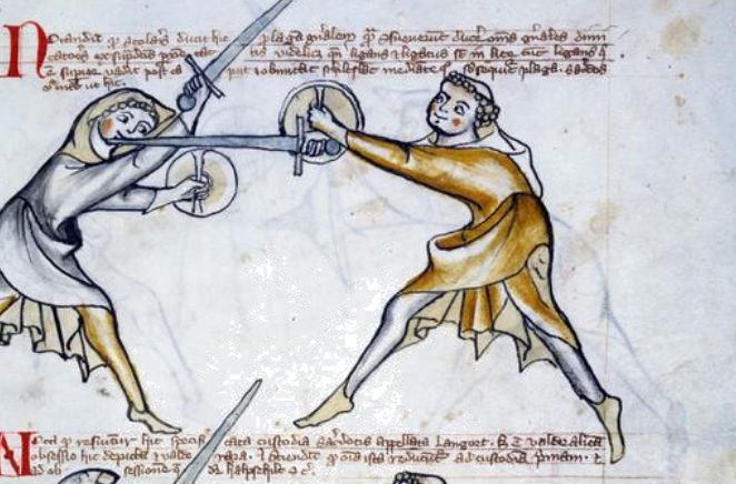 An act of checking the opponent's hands or sword by shield on the right side, while thrusting forward with the sword under my shield arm. It is a recommended technique to do from binding below and on the right, and also after falling under the sword and shield.
