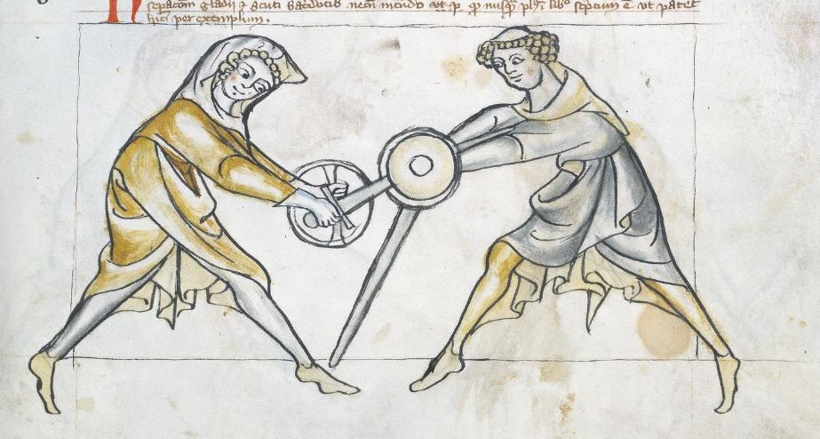 Useful strike that separates sword and shield is presented to us in a dedicated play. It is performed after the rebind to the right, so from the position of binding above and on the right. The idea is to push the opponent's sword down on the right side and immediatelly thrust between the opponent's sword and shield. It is an alternative to schiltslack in this case, and it is faster. But it requires the opponent to leave the gap between his weapons. It is very useful if the opponent is too careless about holding his weapons together.