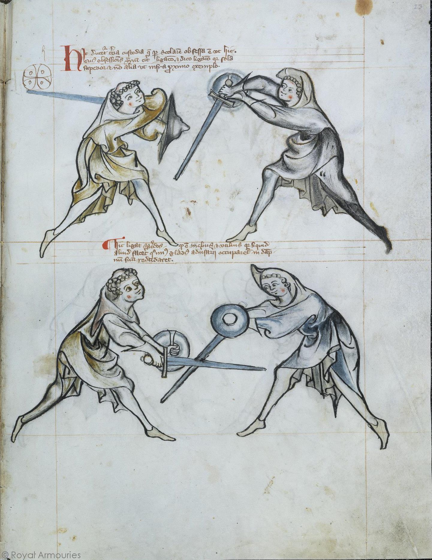| (+) Hic ducetur tertia custodia que per scolarem obsessa est vt hic cuius obsessionis contrarium erit ligacio & dico ligacio quare sola superior & non alia vt infra proximo exemplo Hic ligat sacerdos quod est melius & vtilius quare si quid aliud faceret quominus gladius aduersarii occuparetur in dampnum suum redundaret | (+) Here the priest conducts third ward, which is besieged by the scholar as here. The opposition to this siege will be a bind, and therefore I say bind, but only above, and not another, as in the example below. Here the priest binds, which is better and more useful, because anything else not occupying the adversary's sword would result in harm. |