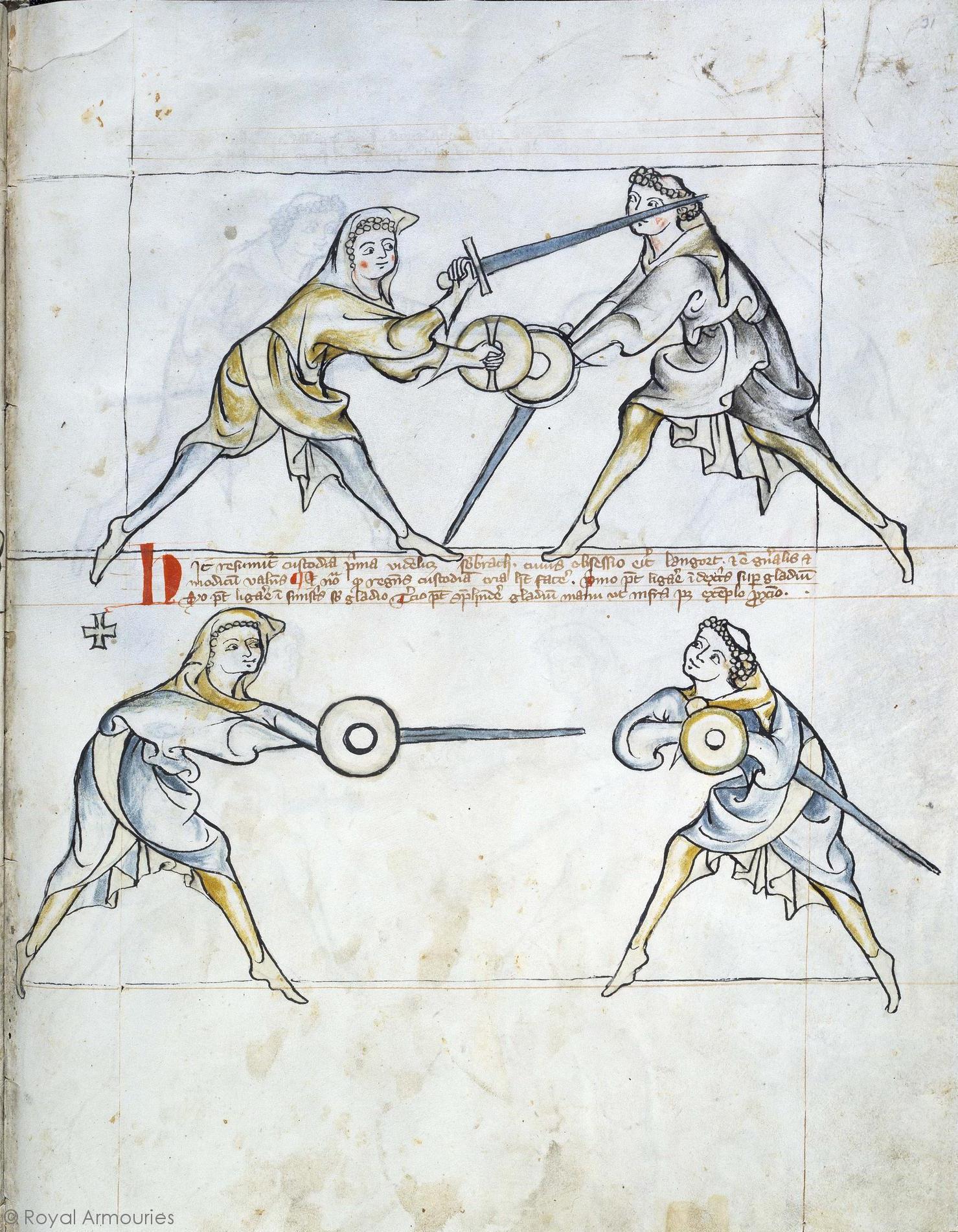 | (+) Hic resumitur custodia prima videlicet sub brachio cuius obsessio erit langort & est generalis & modicum valens & nota quod regens custodiam tria habet facere Primo potest ligare in dextris super gladium Secundo potest ligare in sinistris sub gladio Tertio potest comprehendere gladium manu vt infra patet exemplo proximog | (+) Here the first ward is re- ssumed, namely under the arm, and its siege will be langort, and it is common and of little worth, and note that the one guiding the ward can do three things: first, he may bind on the right above the sword; second, he may bind on the left below the sword; third, he may grasp the sword with his hand, as shown below in the next example. |