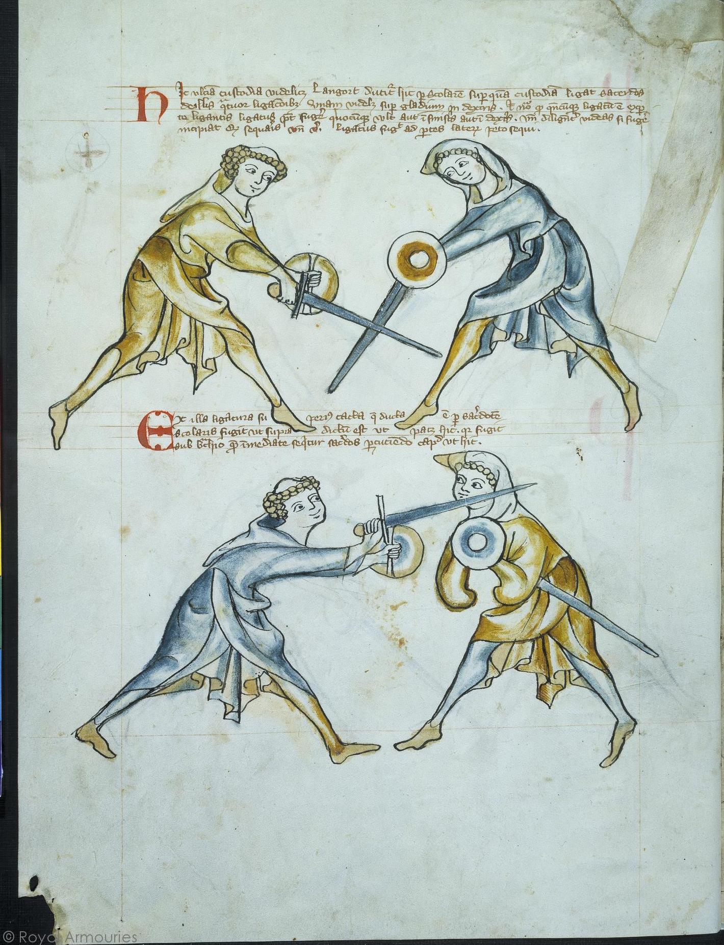| (+) Hic vltima custodia videlicet Langort ducitur hic per scolarem super quam custodiam ligat sacerdos de illis quatuor ligacionibus vnam videlicat super gladium in dextris & nota quod quandocumque ligatum est ex parte ligantis ligatus potest fugere quocumque vult aut in sinistris aut in dextris vnde diligenter videas si fugere incipiat dum sequaris vnde versus ligatus fugit ad partes laterum peto sequi Ex illa ligatura superius tacta que ducta est per sacerdotem scolaris fugit vt supra dictum est vt patet hic quia fugit sub brachio quod immediate sequitur sacerdos percutiendo capud vt hic | (+) Here the last ward, namely langort, is conducted here by the scholar. Above this ward, the priest binds with one of the four binds, namely, above the sword and on the right. And note that whenever there is a bind, the bound may flee from the binder to wherever he wants, to the left or to the right. Hence diligently see that if he begins to flees, you follow him, hence the verse: the bound flees to the side, I try to follow. From this bind touched on above, which is conducted by the priest, the scholar flees as said above, and as shown here: Because he flees under the arm, what follows immediately; the priest hits the head as here. |