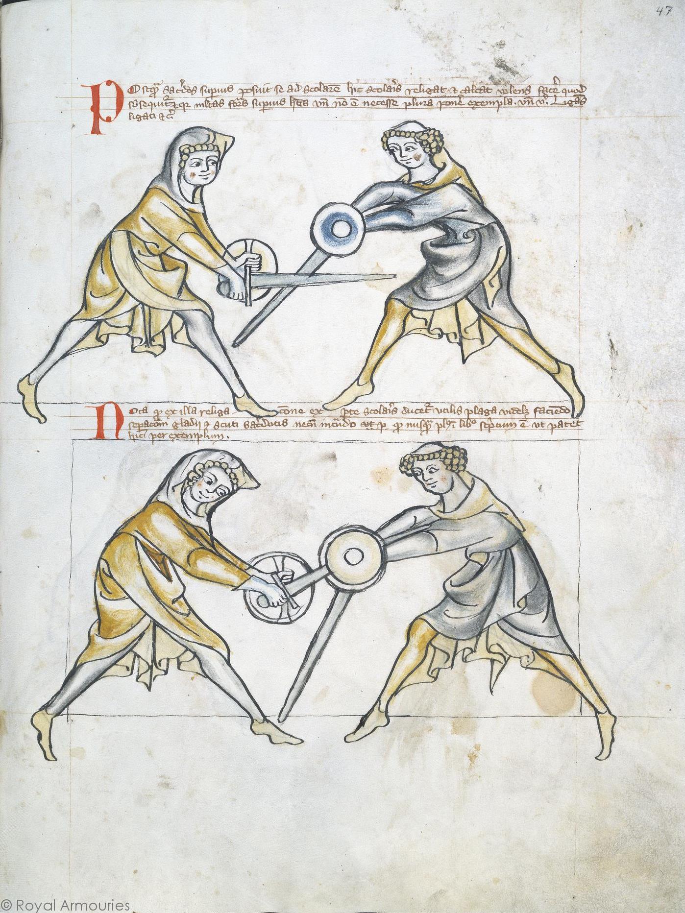 | Postquam sacerdos superius posuit se ad scolarem hic scolaris religat & calcat volens facere quod subsequitur & quia multas formas superius habetis vnde non est necesse plura ponere exempla vnde versus Ligans ligati & cetera Nota quod ex illa religacione ex parte scolaris ducetur vtilis plaga videlicet faciendo separacionem gladij & scuti sacerdotis necnon intrando quod nusquam plus in libro scriptum est vt patet hic per exemplum | After the priest above placed himself to the scolar, here the scholar rebinds and steps, intending to do as follows, and because we had many forms above, so it is not necessary to give more examples. Hence the verse: the binder and the bound, etc. Note that from this rebind on the part of the scholar a useful strike is conducted, namely making a separation of sword and shield of the priest, and entering (but no more is written in the book) as shown here by the example. |