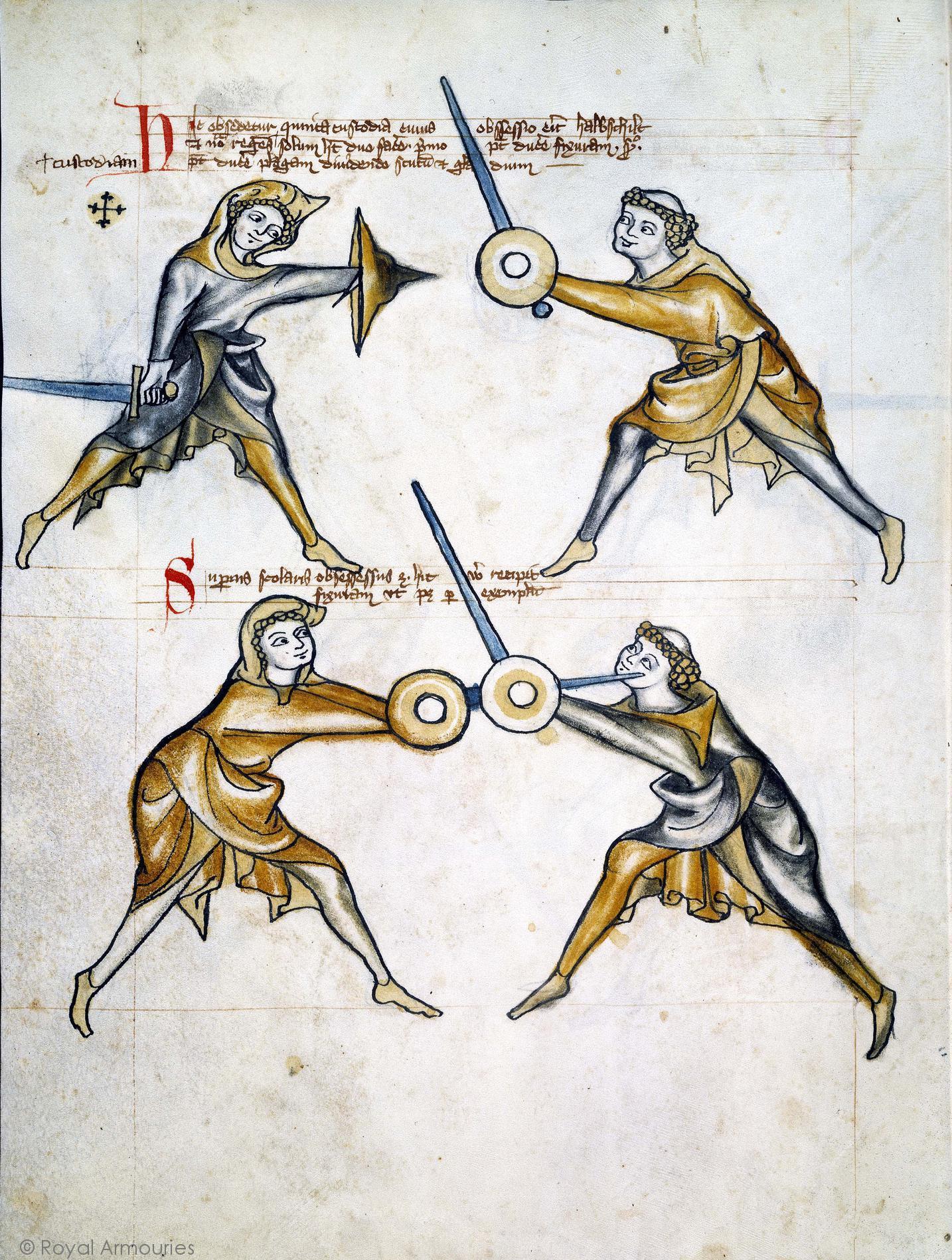 | (+) Hic obsedetur quinta custodia cuius obsessio erit halbschilt & nota regens custodiam solum habet due facere primo potest ducere fixuram secundo potest ducere plagam diuidendo scutum & gladium Superius scolaris obsessus est hic vero recipit fixuram vt patet per exemplum | (+) Here the fifth ward is besieged, the siege being halpschilt. And note, the one guiding the ward may only do two things: Firstly, he can conduct a thrust, secondly, he can conduct a strike to divide shield and sword. Above, the scholar was besieged. Here, however, he seizes a thrust, as shown by the example. |