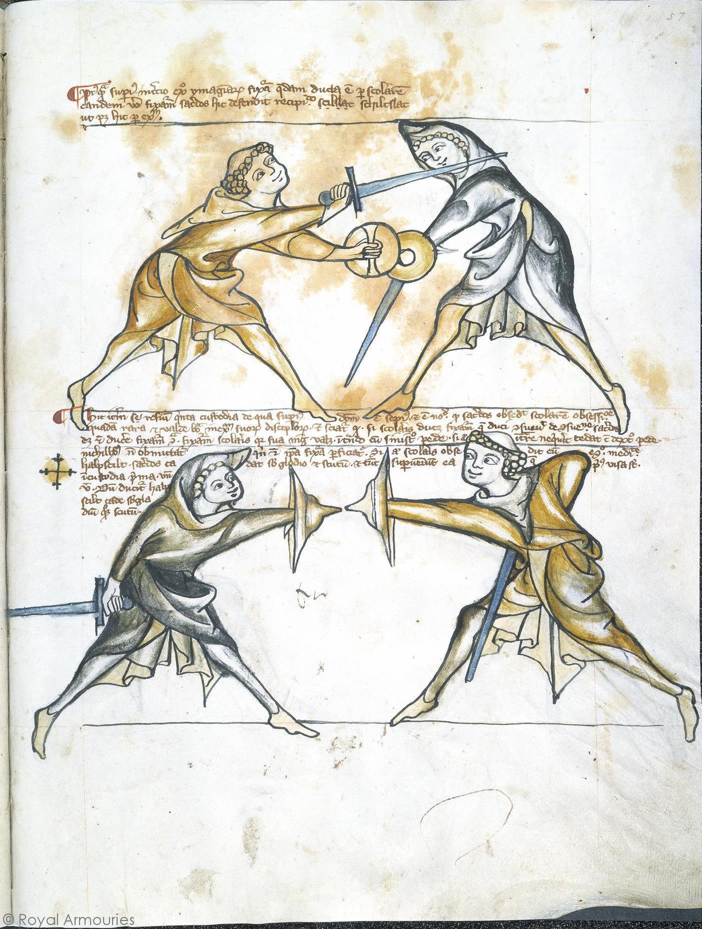 | Prius quam superius in tertio exemplo ymaginarum fixura quedam ducta est per scolarem eandem vero fixuram sacerdos hic defendit recipiendo schilslac schiltslac ut patet hic per exemplum (+) Hic iterum se resumitur quinta custodia de qua superius dictum est sepius & est notandum quod sacerdos obsedit scolarem obsessione quandam rara & valde bona in exemplum suorum discipulorum & sciatur quod si scolaris ducet fixuram que duci consueuit de consuetudine sacerdos debet etiam ducere fixuram contra fixuram scolaris quia sua magis valet intrando cum sinistro pede si autem intrare nequiuerit cedat cum dextro pede nichillominus non obmittatur quin etiam ipsa fixura perficiatur si autem scolaris obsedit eum econtrario mediante halpscilt sacerdos cadet sub gladio & scutum & tunc superueniunt ea que prius visa sunt in custodia prima Vnde versus Dum ducitur halpscilt cade sub gladium quoque scutum | Previously, as above in the third example of the pictures, the thrust was conducted by the scholar, and this same thrust the priest here defends by seizing a schiltslac, as shown here by the example. (+) Here again is re-assumed the fifth ward, of which was often said above, and it should be noted that the priest is besieging the scholar with a siege that is rare and very good, as an example for his disciples. And you should know, that if the scholar conducts a thrust, which is usually conducted by custom, the priest must also conduct a thrust against the thrust of the scholar, because it is more strong, entering with the left foot. If he is unable to enter, fall back with the right foot. Nevertheless do not even omit completing the thrust. But if the scholar besieges him, on the other hand, by means of halpschilt, the priest will fall under sword and shield, and then will supervene those things which were seen before in first ward. Hence the verse: when halpscilt is conducted, fall below sword and shield. |