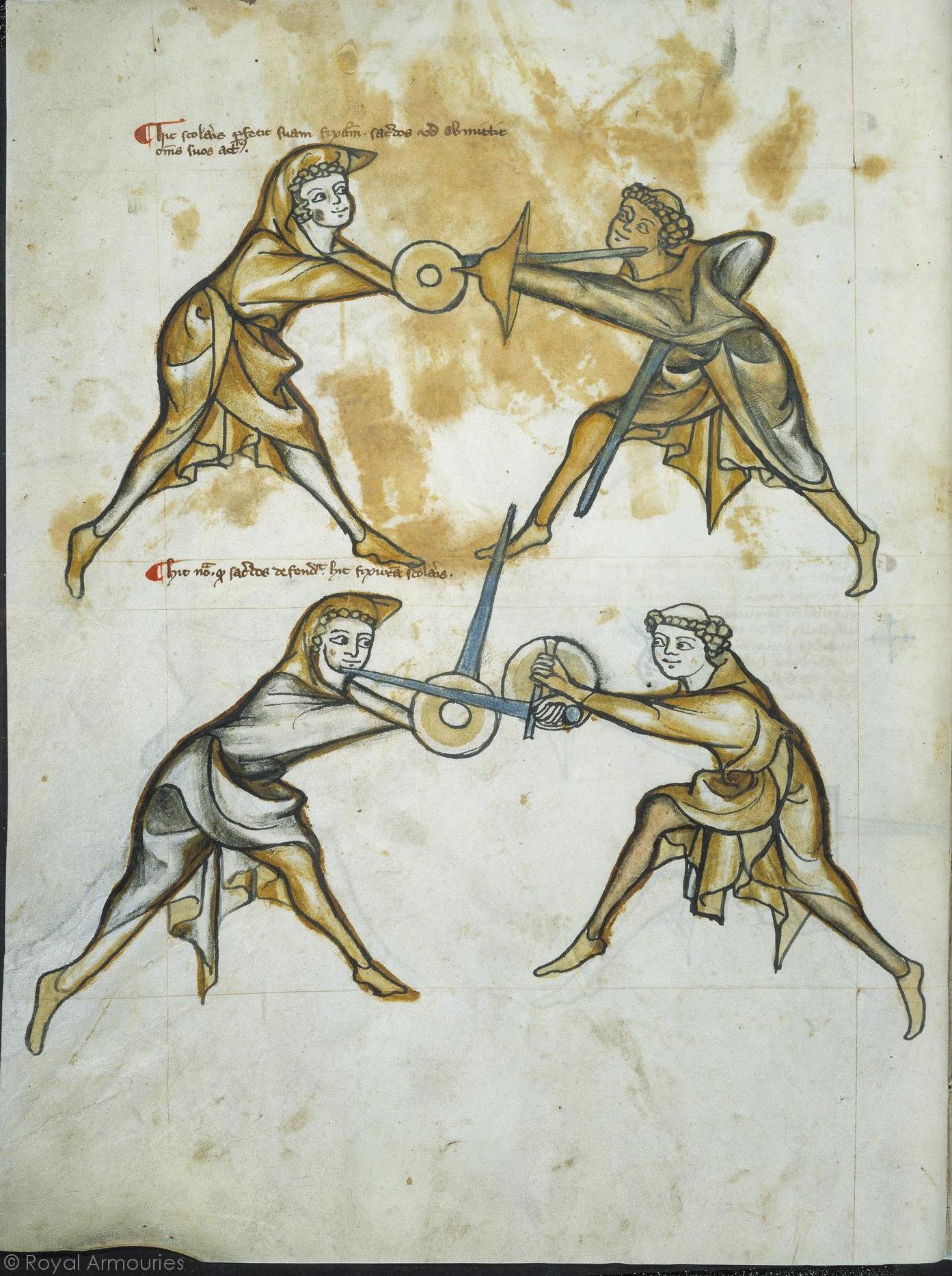 | Hic scolaris perfecit suam fixuram sacerdos vero obmittit omnes suos actus Hic nota quod sacerdos defendit hic fixuram scolaris | Here the scholar completes his thrust, the priest omitting all actions. Here note that the priest here defends the thrust of the scholar. |