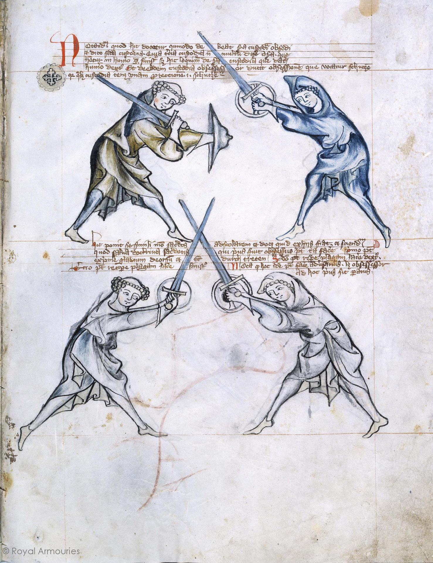 | (+) Notandum quod hic docetur qumodo debeat secunda custodia obside & dico secunda custodia quia tertia custodia non multum differt a secunda que habetur in humero sinistro sed hic loquimur de secunda custodia que datur humero dextro Et de eadem custodia obsessessor ducit obsessionem que vocatur schutzen quare quelibet custodia tenet vnam proteccionem i. schutzen Hic ponit se simili modo sacerdos ad scolarem et docet quid ex hijs fiat & sciendum quod salua doctrina sacerdotis qui prius fuit obsessorus potest tria facere Primo potest exprimere gladium deorsum & tunc durchtreten Secundo potest recipere plagam latere dextro Tertio potest recipere plagam latere sinistro Nota quod hoc idem potest facere aduersarius licet obsessessor ad hoc prius sit paratus | (+) It should be noted here that it should be taught now the siege of second ward. And I say the second ward because the third ward (which has the left shoulder) does not differ much from the second. But here we speak of the second ward, which is given to the right shoulder. And out of the same ward, the besieger conducts the siege called schutzen, for that reason each ward holds one protection (ie. schutzen). Here the priest places himself in a similar manner to the scholar, and teaches what happens from these things. And know that the saving doctrine of the priest is he who had been besieged prior can do three things: first, he can press out the sword downwards and then durchtreten; second, he can seize a strike on the right side; third, he can seize a strike on the left side. Note that the adversary can do the same thing, although the besieger is first to be prepared. |