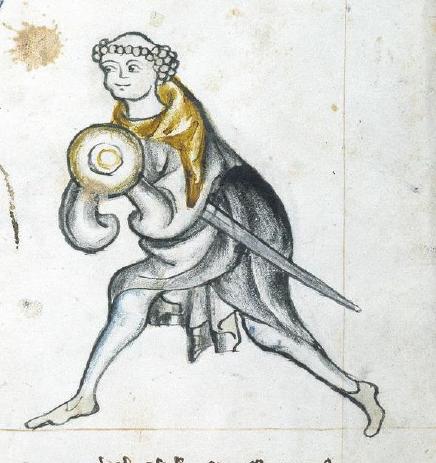 Prima custodia is another example of a custodia, that may be used by itself as an obsessio. The possibilities of prima custodia seem to be limited - it can besiege only another prima custodia. The idea is that you can extend both your hands from prima custodia, hitting the opponent's shield before he can move it, thus pinning it down at his body. As the first play explains, this kind of siege can be defended by a halpschlit-like descending cut from prima custodia, that will threaten the besieger and fend the attempt at pinning the shield down.