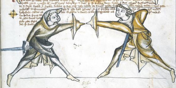 This is an action launched from prima custodia or priest's special longpoint, against the opponent in quinta custodia. Because quinta custodia in I.33 is shown to be a position that launches a lot of in-tempo counterattacks, this obsessio is designed to defeat it. The aim is to hit the opponent's shield by the shield of my own, while keeping my word hand retracted and so still prepared to handle the counterattack of the opponent. There are few possible outcomes of that.